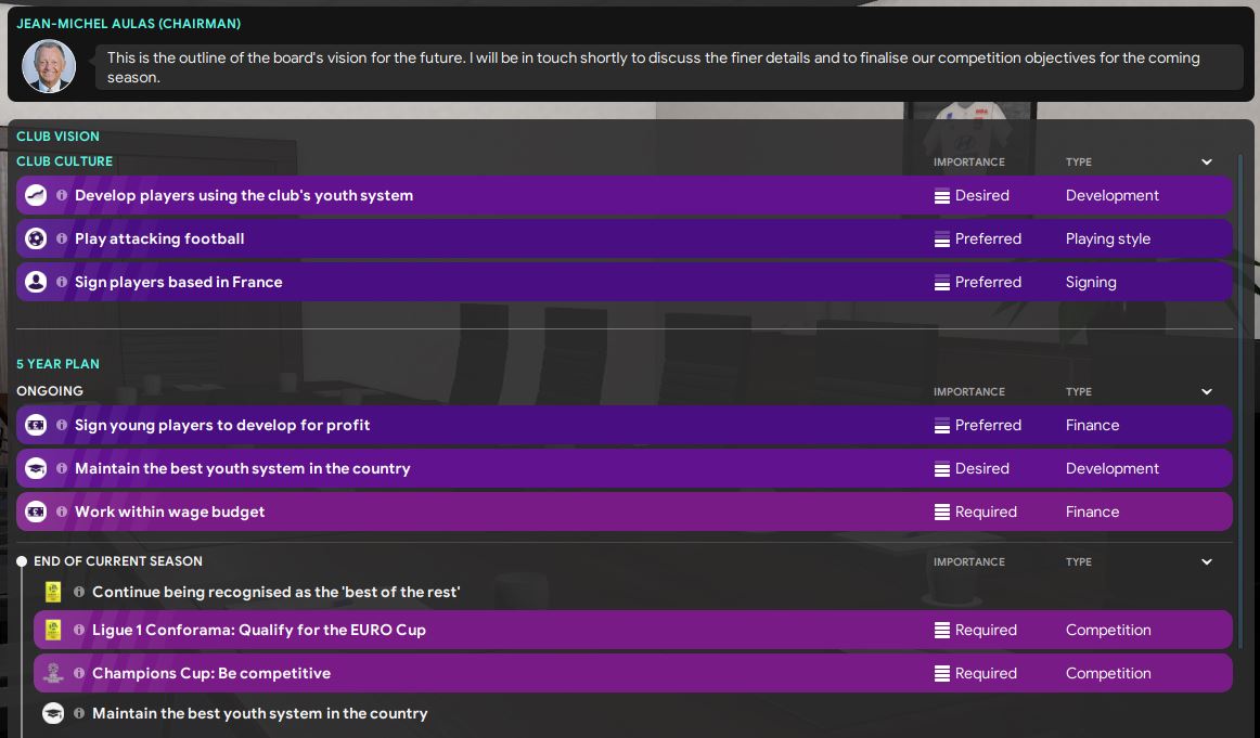 The vision of the club isn’t too difficult to achieve. The only thing that you might want to take note is ‘signing players based in France’. Lyon is a club that has many good young local players, so it might be a challenge to sign some other young players in the same league because ‘sign young players’ is also another plan. However, it is pretty good that the board doesn’t put too much pressure on the Champions League.