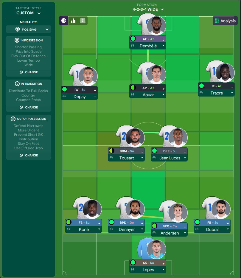 Lyon’s players are very attacking minded, even the central defenders. As a result, I created an attacking tactic, using 4-2-3-1 as the formation. I call it – 4231 Flying Fox.