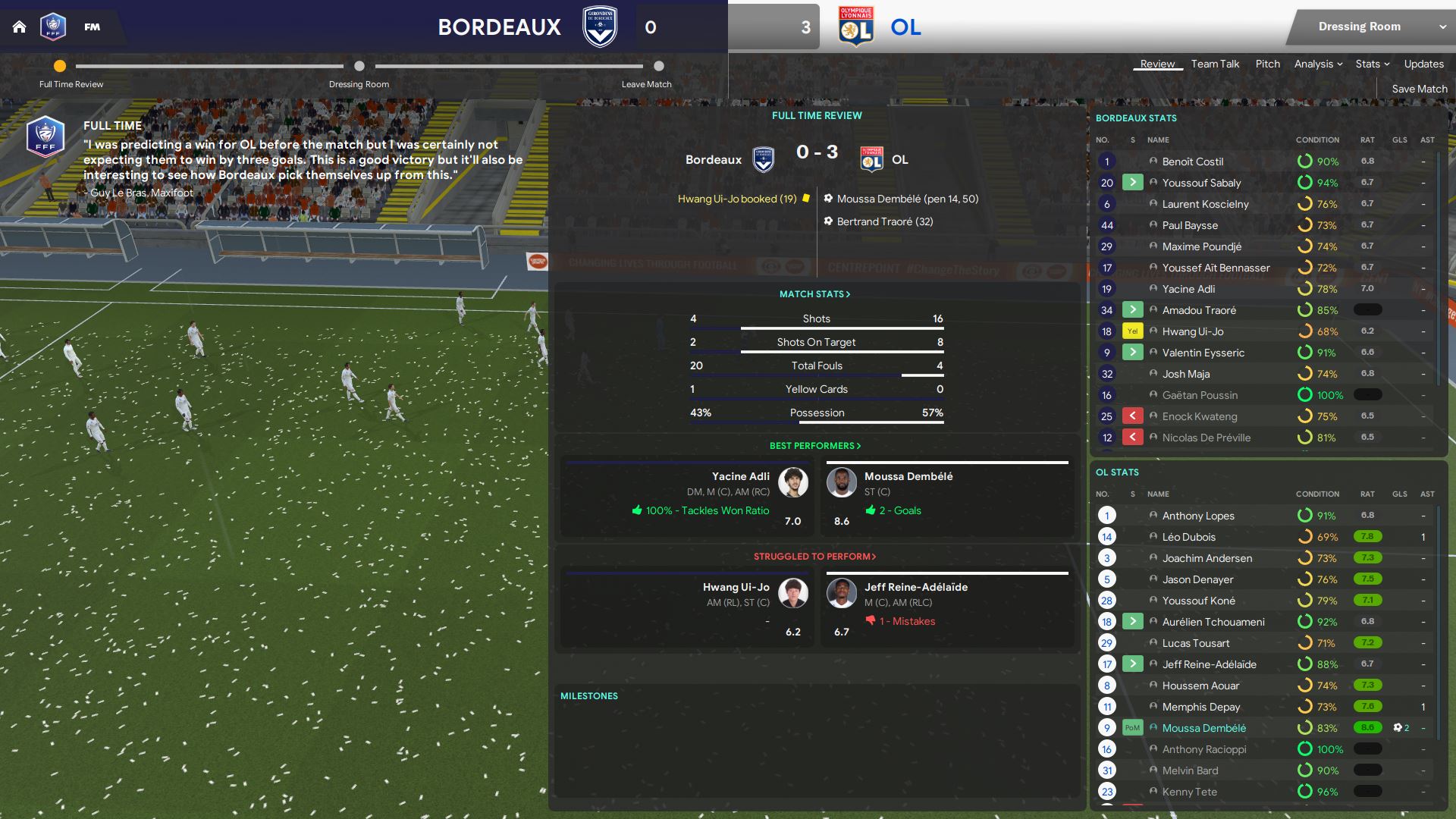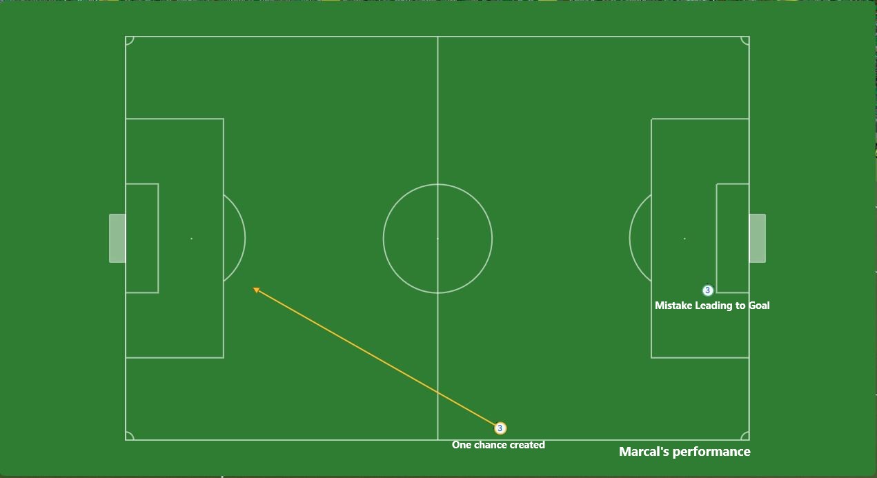 I made a gamble in this game by choosing Marcal as the left back and Caqueret as the DLP Support. Marcal hasn’t started a game before, so does Caqueret. Unfortunately, Marcal made a mistake leading to goal despite providing a key pass at the 8th minute. I thought he did ok in his first game after an injury, but he can definitely do better. Caqueret had a pretty solid game as a DLP support. He gained 2 possessions and made 2 key passes with 0 mistake and 0 possession lost.