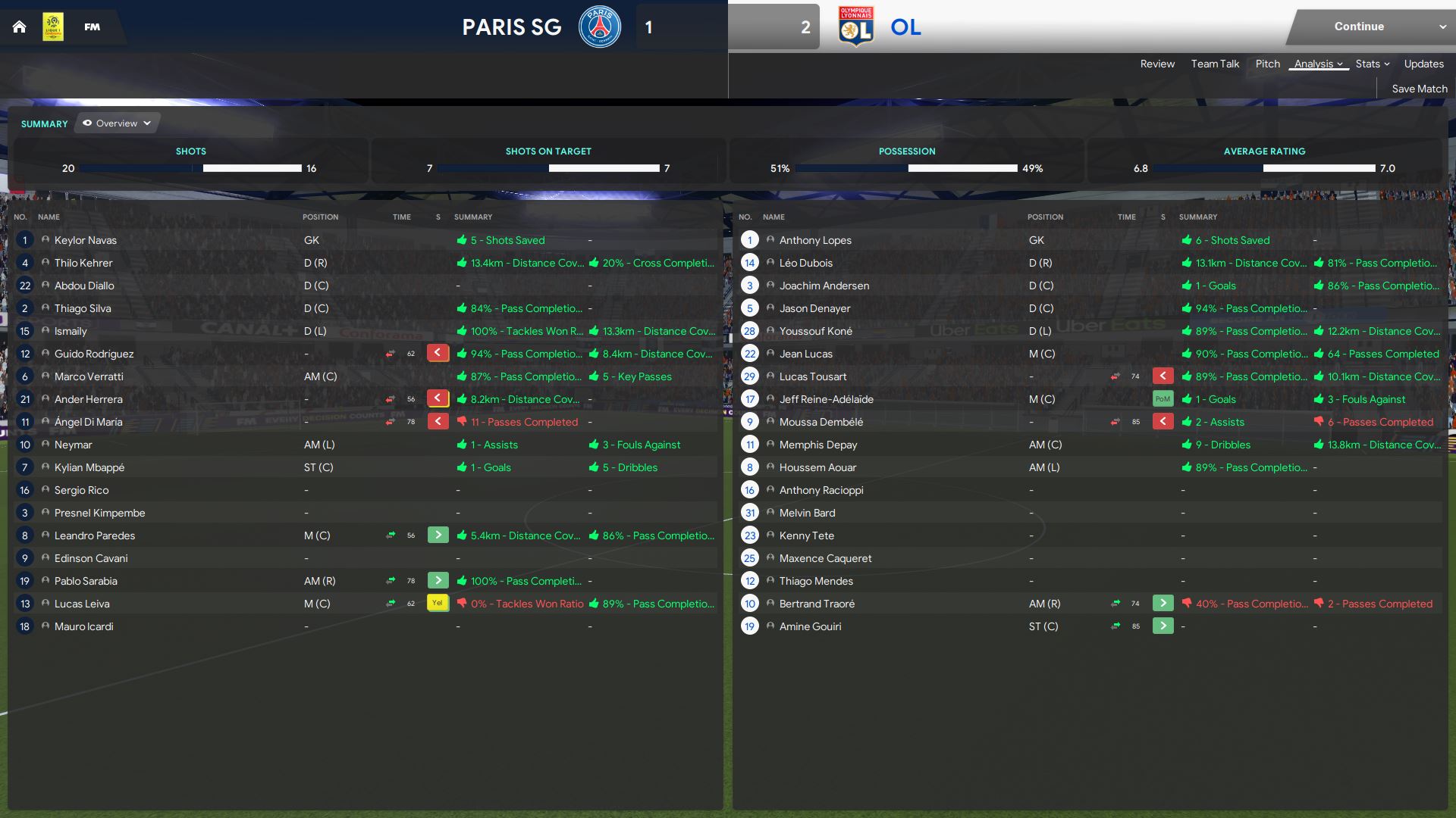 PSG pulled one back in the 21st minute. Neymar dribbled into the box and took a shot. Dubois blocked the shot well but Kylian Mbappe was there to pick up the rebound. I wasn’t too upset because we defended well and it was just unlucky that the ball reached Mbappe’s foot. I did not do any big changes and both teams were just extremely quiet in the second half. The game finished 1-2 and Lyon collected the 3 points in Paris.