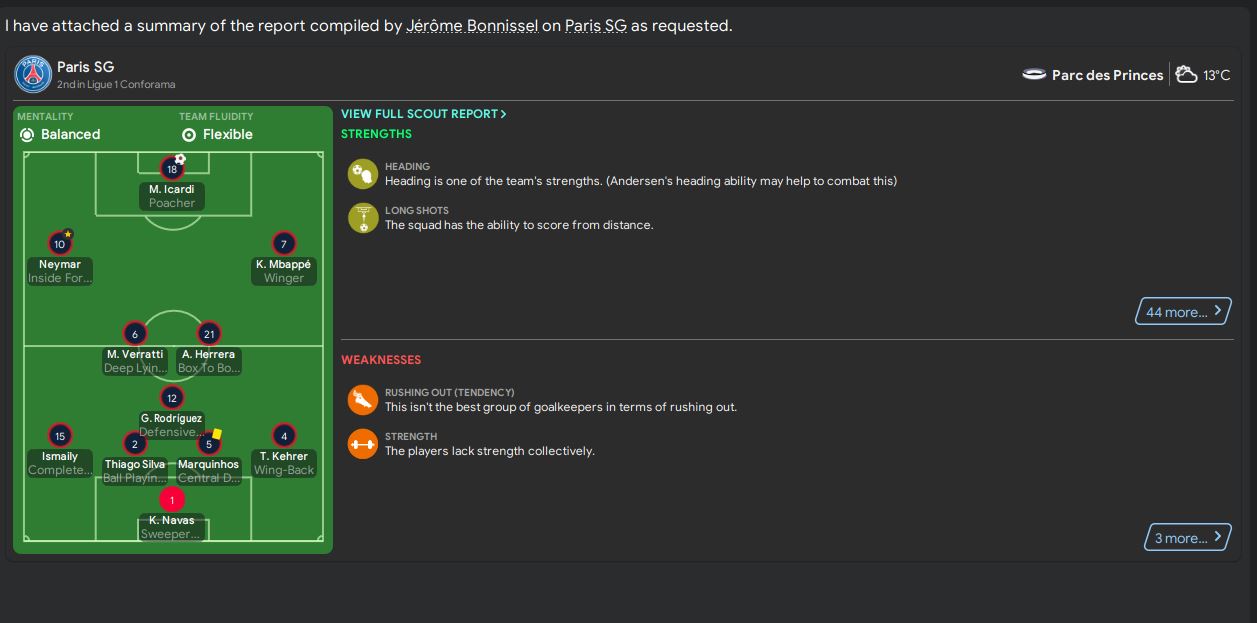 As usual, I was analysing the opponent before each game. According to the scouting report, heading and long shots were their main strengths. Then, I looked at their front three and I shook my head. Neymar and Mbappe can shot from distance and Icardi can win challenges in the air. In order to counter that, I adjusted the line of engagement to lower and defensive line to higher. The main reason is to narrow down the space between the defence and attack, as well as giving PSG a limited space to operate the ball. I also changed Counter-Press into Regroup, to ensure my players are not playing out of the position in the game, as PSG is extremely dangerous in counter-attacking. I wasn’t paying too much attention in their weaknesses as I was pretty happy with our team’s attacking play. I was pretty confident that we would at least score one goal in this match.