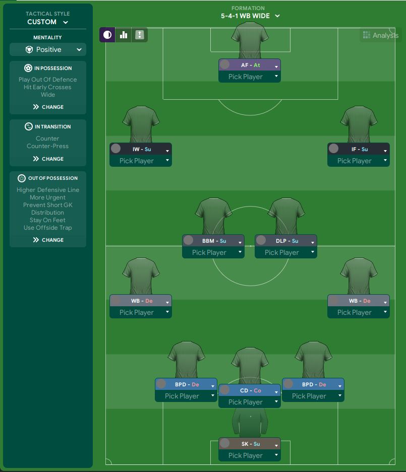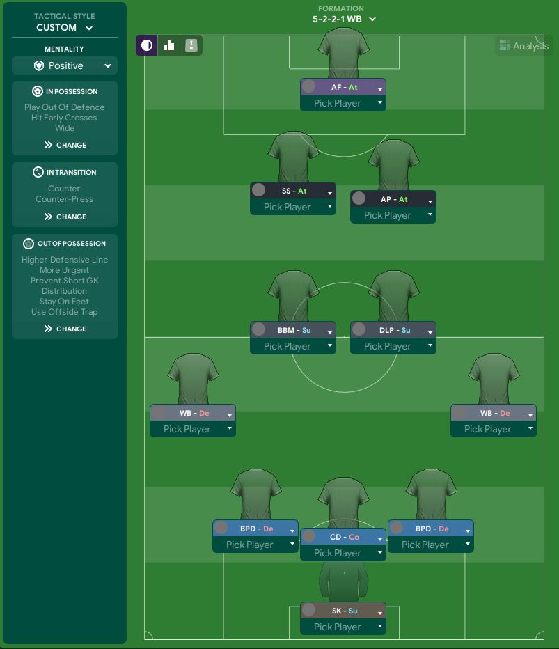 This is the initial 5-2-2-1 I have created, and this is a super attacking tactic. My idea is to fully utilise our wingbacks as most of our assists have come from crosses last season. I want my wingbacks to push higher up the pitch so they can create more chances to the striker up front. Another thing that I wanted to try out is the combination between an Advanced Playmaker and a Shadow Striker. I was looking forward to seeing how these two roles work together in a tactic, followed by an Advanced Forward in front of them.
