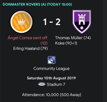 It was an away game for us, but we managed to get the 3 points in the first game of the season. Donmaster Rovers’ Angel Correa received a red card after an awful tackle in the 10th minute in the game, which made them only had 10 men on the pitch. Neither teams had scored a single goal in the first half, but in the last 15 minutes, 3 goals were scored.