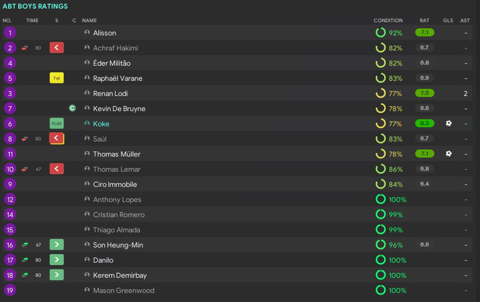 Koke (91’) – The winning goal came in at the 91st minute. Renan Lodi was bringing the ball forward at the left flanks. Most of our players were running towards the opposition box as well. Lodi realised there were too many defenders inside the box. He then made an amazing decision, passing the ball to Koke who arrived late to the box. Koke aimed at the bottom right corner, smashed it hard and low in the net. 2-1! Game over!
