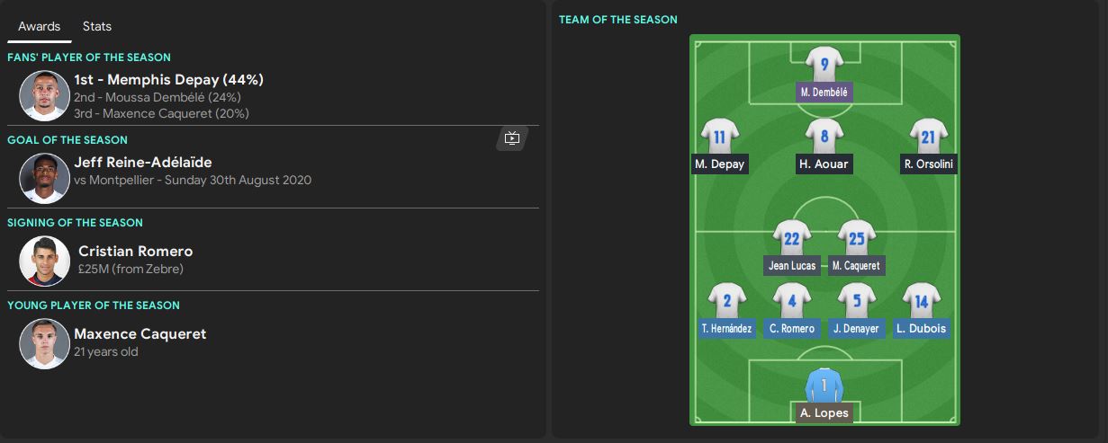 Furthermore, let’s have a look at the End of The Season Awards. Memphis Depay once again scoops the Fans’ Player of the Season with 44% of votes. Moussa Dembele and Maxence Caqueret only got 24% and 20% respectively. Jeff Reine-Adelaide is awarded the Goal of the Season where he scored a long-range volley against Montpellier. Cristian Romero is the signing of the season while Maxence Caqueret is the Young Player of the Season.