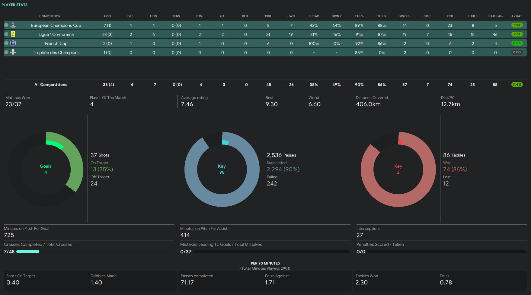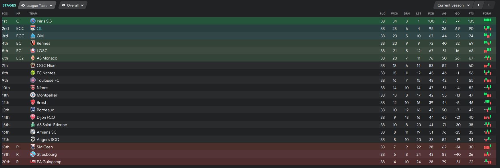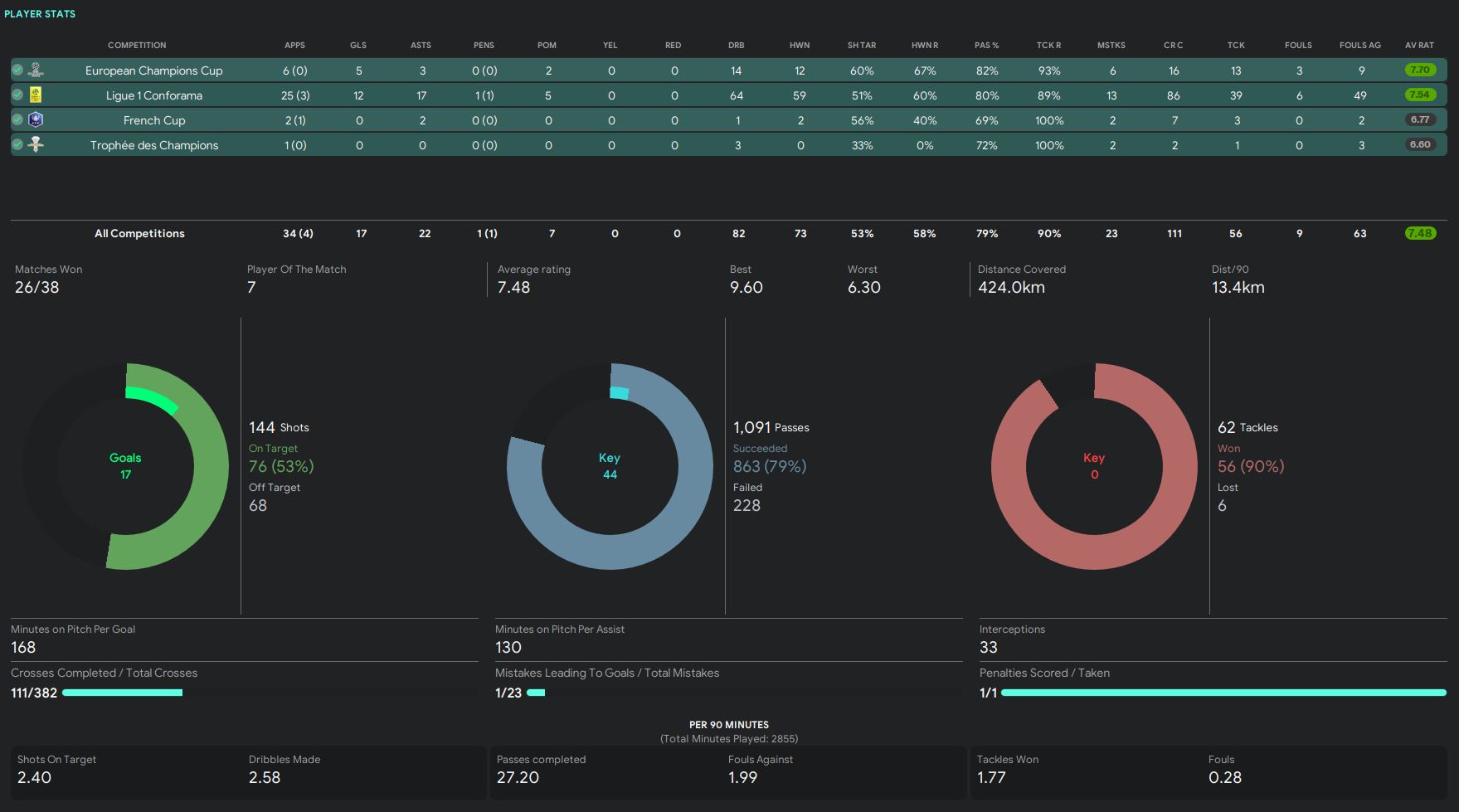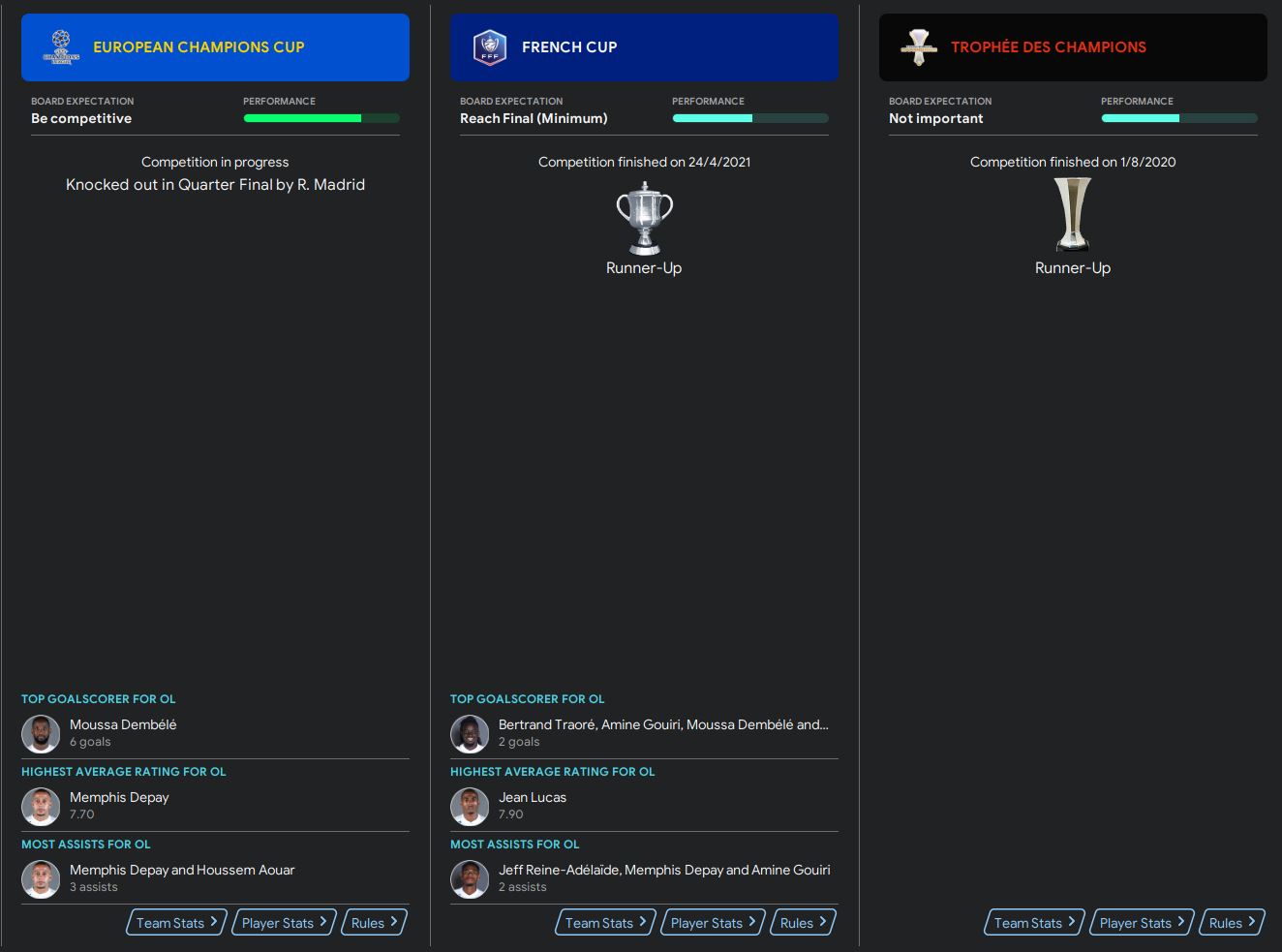 In terms of the competitions, the board only expects us to qualify for the Europa League which is finishing between 4th to 6th position in the league. We exceed the expectation with a much better result, finishing at the 2nd position. In Champions League, the board only wants us to be competitive, which again we hit the expectation and played extremely well in the competition. The board sees French Cup as a quite important competition. We did reach the final, but we did not lift the trophy unfortunately. Trophee des Champions is not important, and we only finished as the runner-up.