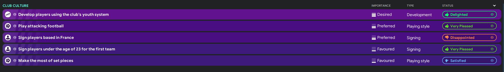 Moving on to the club culture, the board is delighted that we develop players using the club’s youth system. Indeed, I feel like our youth coaching system is great and we do have a couple of young prospects in the team. In addition, our transfer budget isn’t that high, so I have to develop our young players instead of making signings. We did produce great young players this season, for example Maxence Caqueret, Melvin Bard and Amine Gouiri.