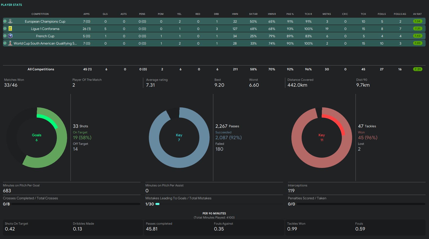- 71.17 passes completed per 90 (2nd highest in the team)
