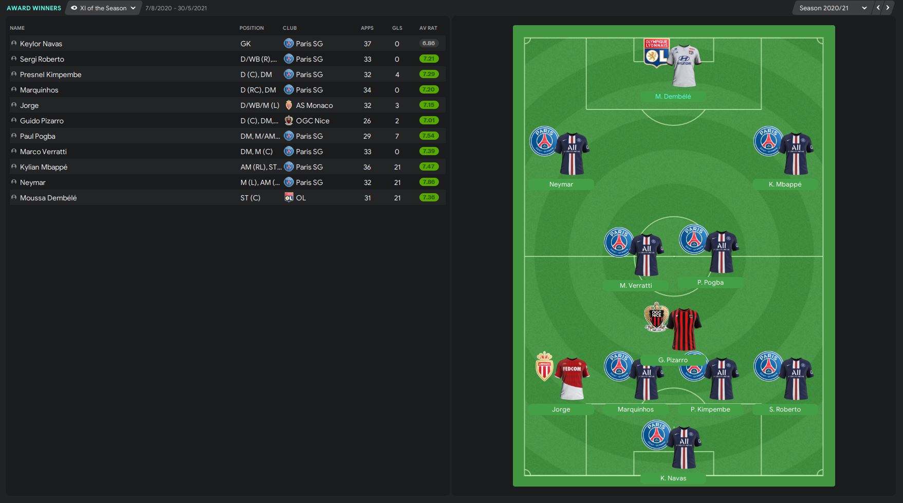 Ligue 1 XI of the Season looks fair. 8 players from PSG, 1 from OGC Nice, 1 from AS Monaco and 1 from Lyon. Our only player who gets himself into the team is our striker Moussa Dembele. Neymar just beat our best player Depay at the left winger position and Marquinhos and Kimpembe beat Cristian Romero and Jason Denayer as well because they have more clean sheets. Fair enough.