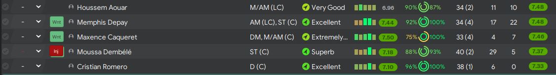 Now, let’s come back to the usual stuff we do after a season, analysing some of our best players. After looking at the average ratings, these are the 5 players that have been sensational over the season, most importantly they are some surprises here – Houssem Aouar, Memphis Depay, Maxence Caqueret, Moussa Dembele Cristian Romero.