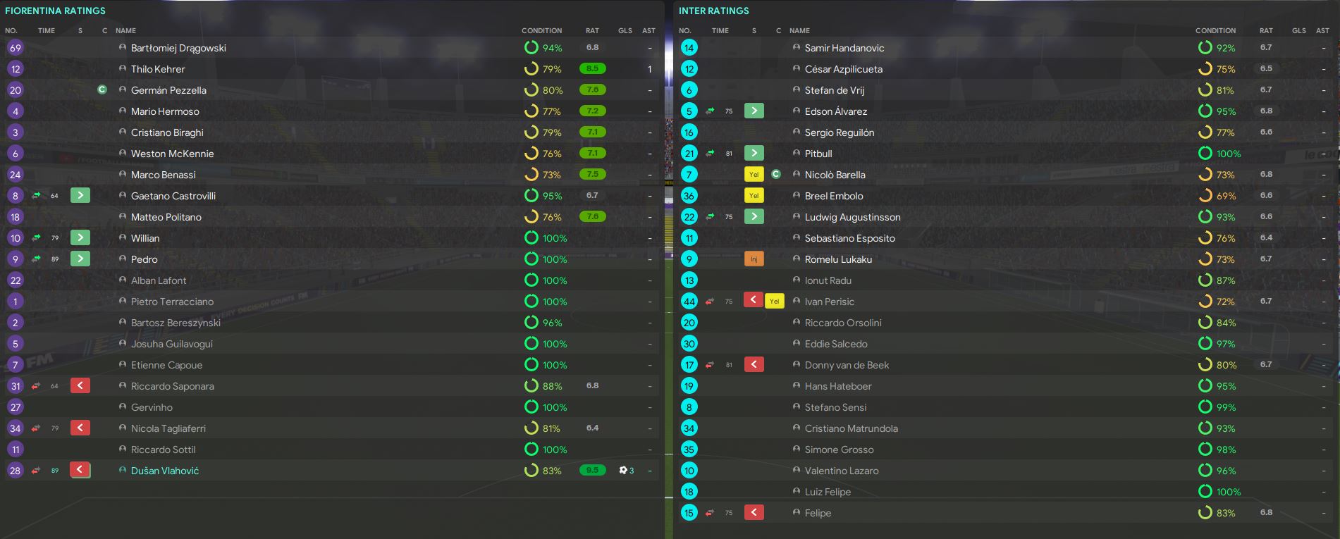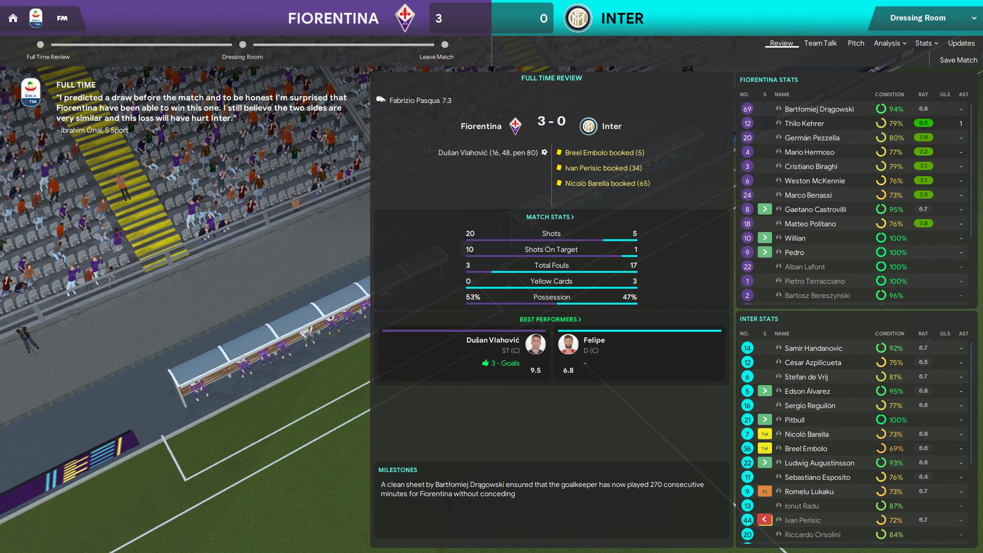 We won the game with 3-0. Dusan Vlahovic scored 3 goals, his first hattrick of the season, also the our first hattrick as the manager of Fiorentina. Looking at the match stats itself, we had 20 shots in total, 10 on target, and we even had more possession. On the other hand, Inter Milan only had 5 shots in 90 minutes, and the only shot on target came in the 88th minute. What a performance!