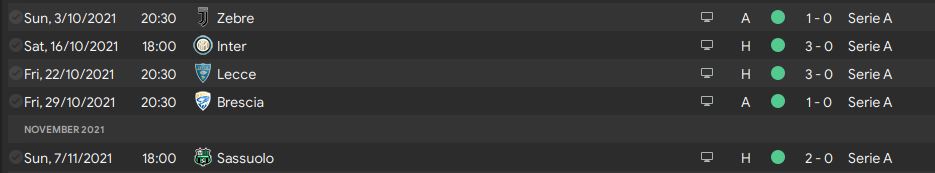 We played our last match before the international break on 7th November. A comfortable 2-0 win against Sassuolo, which makes us 5 matches won in a row. Surprisingly, it is also our 6 clean sheets in a row. Our defence looks very solid. In terms of attack, we are still the top goalscorers in the Serie A with 25 goals. With this incredible performance, we are still at the top of the table with 28 points, 7 points ahead of the 2nd position. Napoli will potentially become the runner-up after the next game, but there will still be a 6 points gap between us.