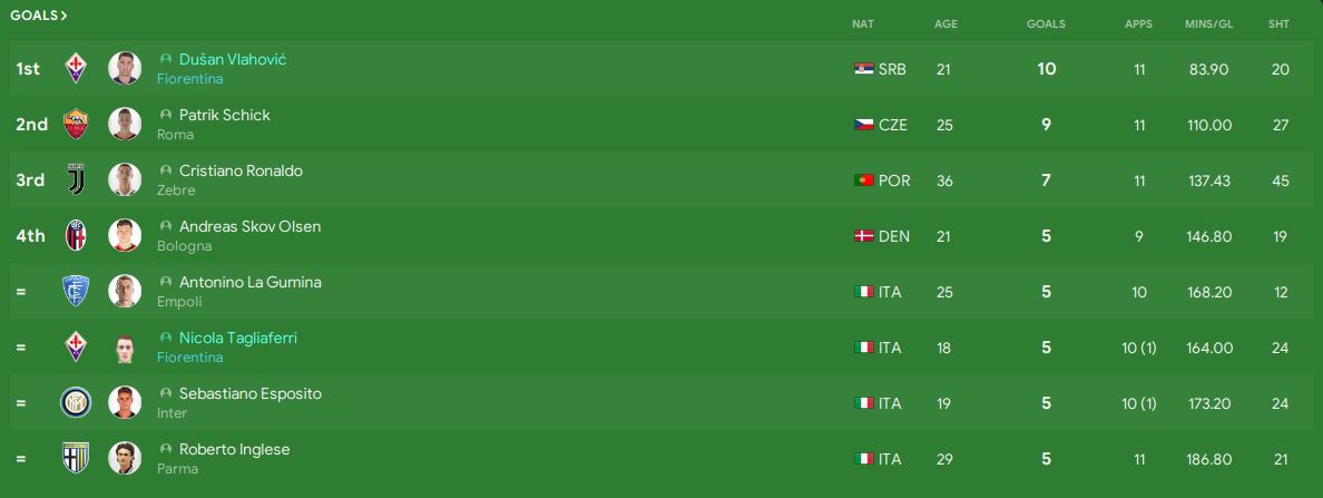 Moving on to the player stats, Dusan Vlahovic is the current top scorer in the league with 10 goals while Nicola Tagliaferri is at the 4th position with 5 goals. Both of the them are amazing forwards. Dusan Vlahovic only had 20 shots in total to score 10 goals, which is a 50% of goal ratio. His minute per goal is 83.9, which is equivalent to 1 goal per match.