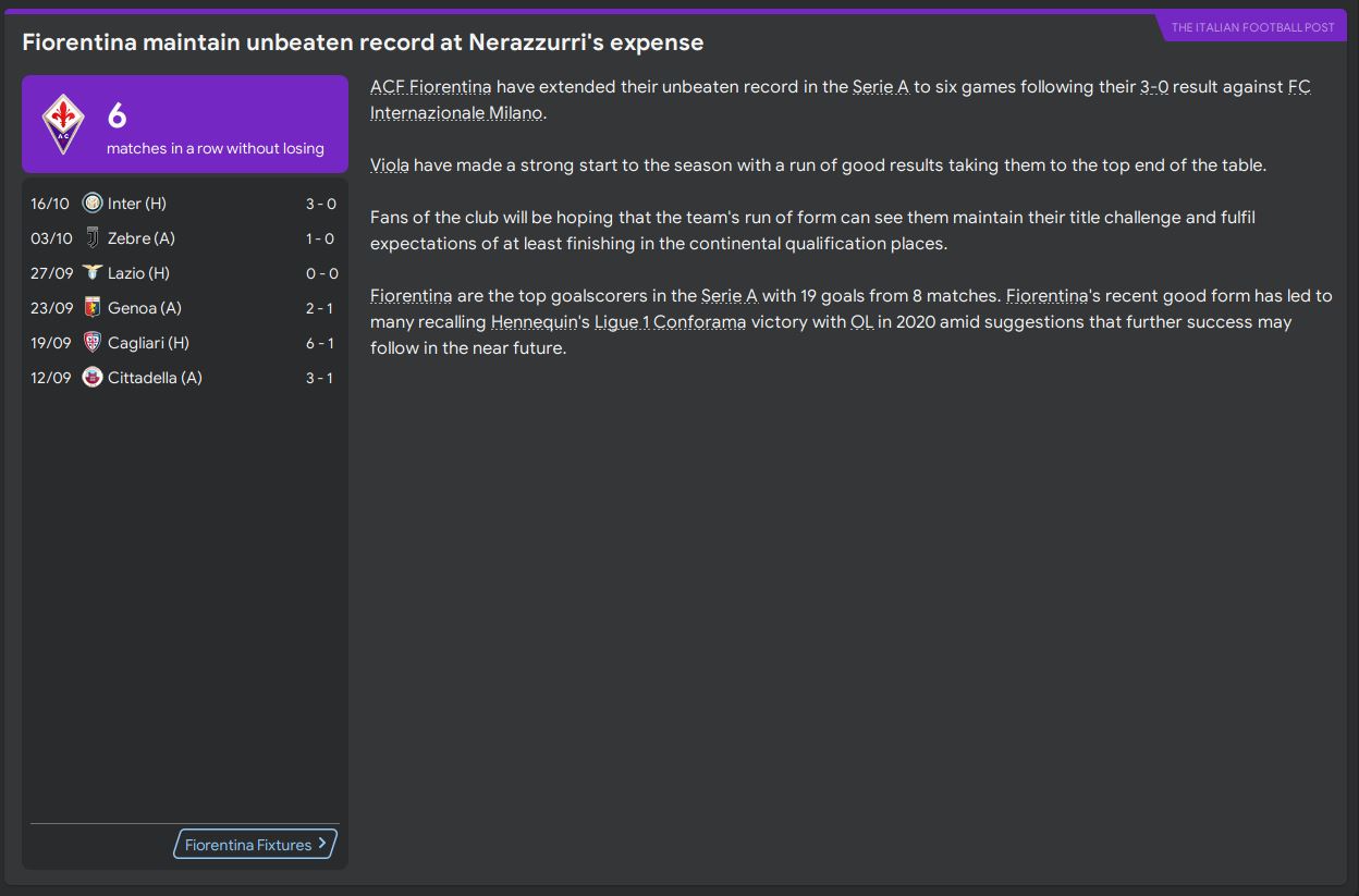 After beating Inter Milan, that makes us 6 matches in a row without losing. We are also now the top goalscorers in the Serie A with 19 goals. Look at the news, they mentioned that ‘many recalling Hennequin’s Ligue 1 vicotry with Lyon in 2020 amid suggestions that further success may follow in the near future’. Yes! That’s what we like to see! We are definitely going to bring Fiorentina to a higher level and qualify for the Champions League next season!