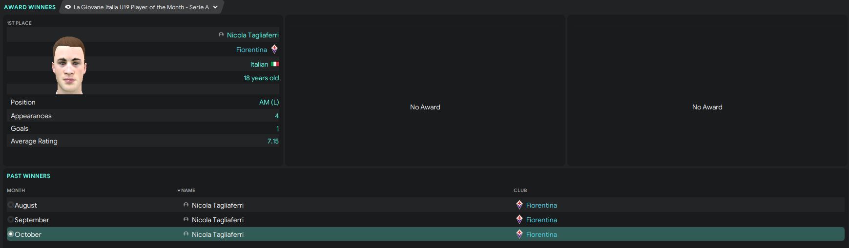 Other than that, our wonderkid Nicola Tagliaferri once again scooping the Serie A U19 Player of the Month for the third consecutive month. Although Tagliaferri only scored 1 goal this month, but the goal was against Juventus, which is a very important goal for us. He did make 2 assists in October, one was in the 3-0 win against Lecce, another one was the 1-0 win against Brescia, which is another important contribution again.