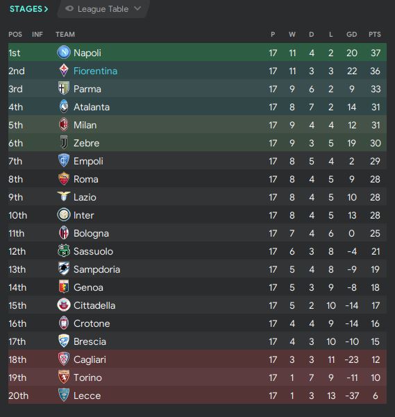 A little revision of our current position in the league. We are sitting at the 2nd position right now with 36 points. We have 11 wins, 3 draws and 3 losses so far. Napoli is now the leader of Serie A with 37 points, just one point ahead of us. Fortunately, one point isn’t too bad for us. We will still have to chance to go to the top of the league again. Surprisingly, Parma is at the 3rd position. The ex-Fiorentina Manager, Stefano Piolo, is the current manager of the Crociati, and he is doing an amazing job right now. Atalanta and Milan are sitting at the 4th and 5th position with 31 points, meanwhile the defending champion Juventus is sitting at the 6th position with 30 points.