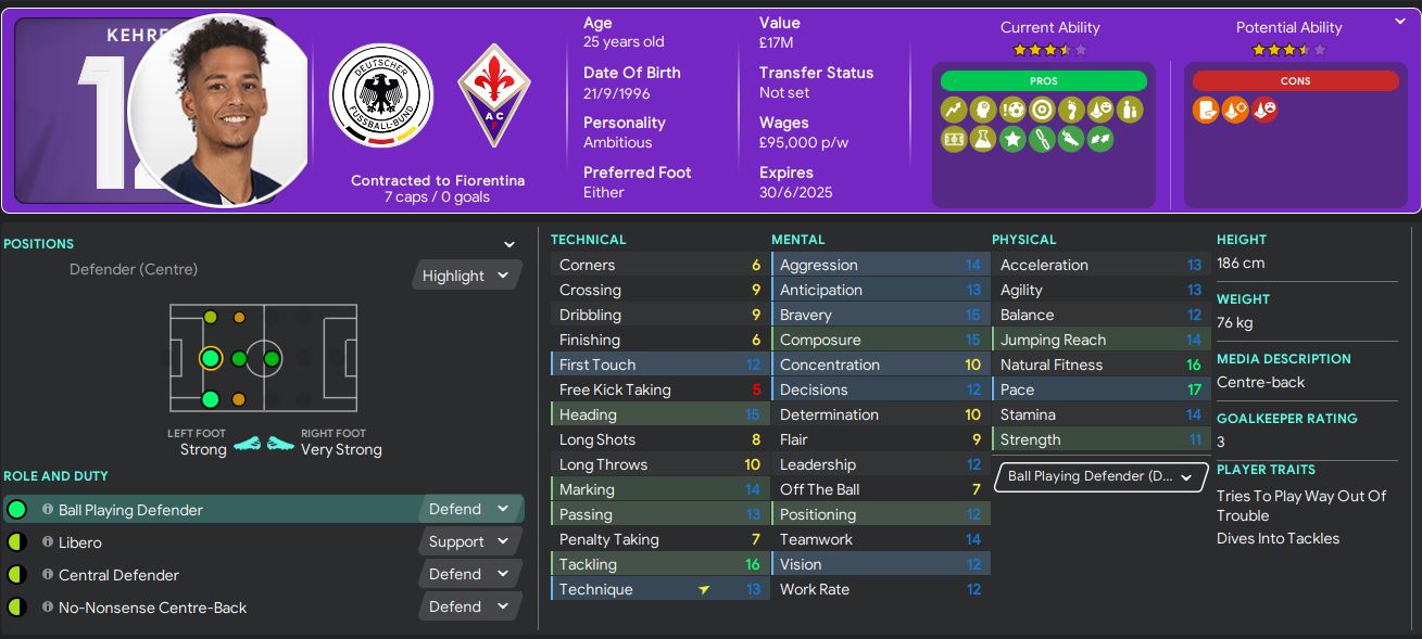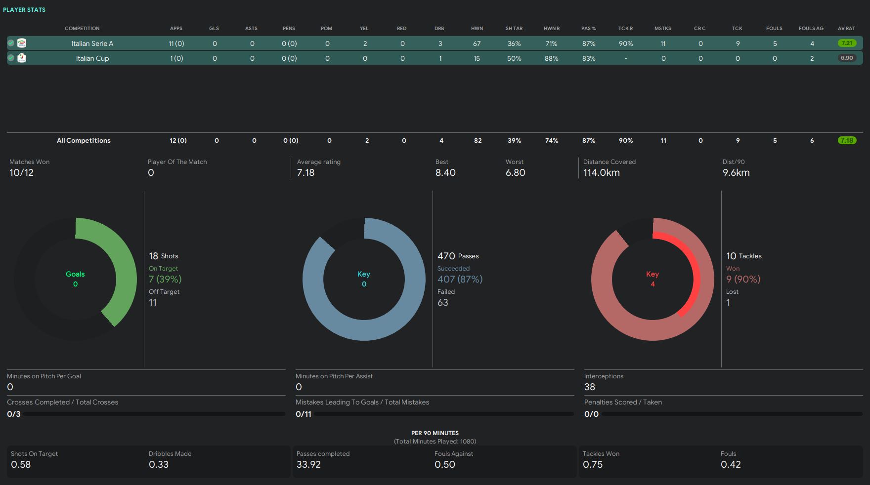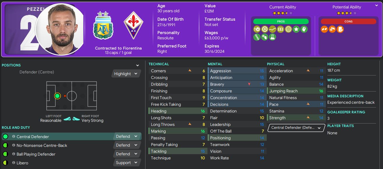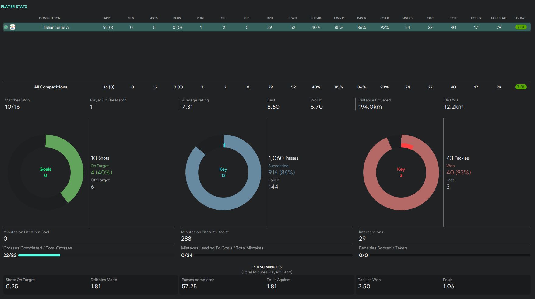 Our skipper, Pezzella, is just solid as a wall at the back. He leads the defence well, winning everything in the air, and he is also an important key player in the dressing room. Below are his key stats.