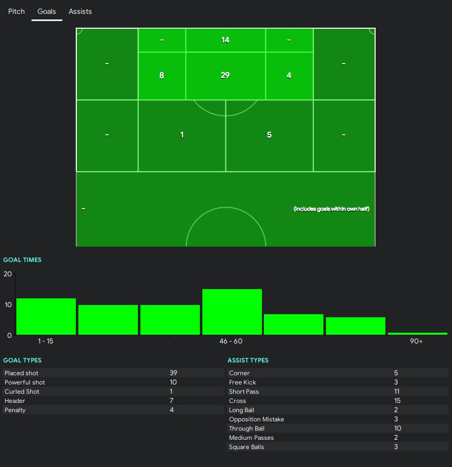 Let’s have a look at the goals we have scored so far. We have a total of 61 goals so far including the pre-season friendly matches. 39 of them comes from placed shot, 10 powerful shot, 7 headers and 4 penalties. Beside that, the assists are mostly crosses, short passes and through balls. We scored 6 goals outside the box in 61 goals, which is quite a good number to be fair, nearly 10% of our goal comes from outside the box. 29 goals are scored at the penalty area, which proves that our attackers are clinical up front. Surprisingly, we have 14 close-range goals right at the six-yard box. Moving on to the goal times, as you can see here, we always score at the early game between the 1st minute and the 15th minute. We score most of the goals between the 46th minute and the 60th minute, which I personally think it is a crucial period in the game.