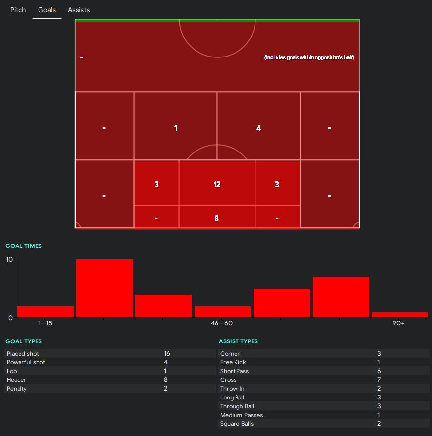 Furthermore, we will have a look at the goals we have conceded. It doesn’t look too bad to be fair. We conceded 16 placed shot and 8 headers. 7 from crosses and 6 from short passes. Most of the goals come from the penalty area of course, but we also conceded 5 goals outside the box. The only concern here is the goal times. We conceded most of our goals between the 16th minute and the 30th minute, which is fine. However, we also conceded a lot of goals between the 76th minute and the 90th minute, which is not looking great. This shows the fact that our players’ concentration is not great. Also, we might have to make some small changes on our tactics at the 70th minute, like wasting more time to secure our lead.