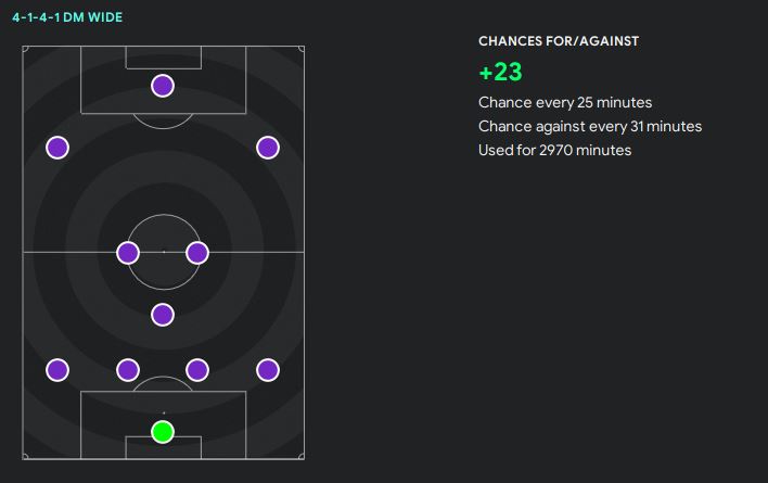Next, this is the report that I would like to see – how many chances did we create and face in 90 minutes. This is looking very, very great. From the report itself, it shows that we create a chance in every 25 minutes, but we also have a chance against us every 31 minutes. However, I just care about the numbers here. We have a +23 in chances for/against, which means our tactics is looking very positive.