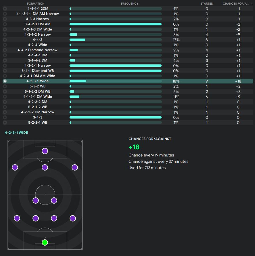 We absolutely love playing against 4-2-3-1 wide. According to the report, we create a chance in every 19 minutes, and we have a +18 in chances for/against. The good news is 18% of our opponent started this formation in the league. However, we struggle to create cahnces against 4-3-1-2 narrow, which means we will have to figure out how to face a team that plays narrow formation. Overall, our tactics are looking great.