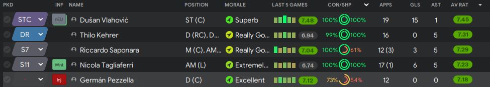 Moving on, let’s start with analysing some of our best players in the first half of the season. After looking at the average ratings, these are the 5 players that have been providing consistent performance – Dusan Vlahovic, Thilo Kehrer, Riccardo Saponara, Nicola Tagliaferri, and German Pezzella.