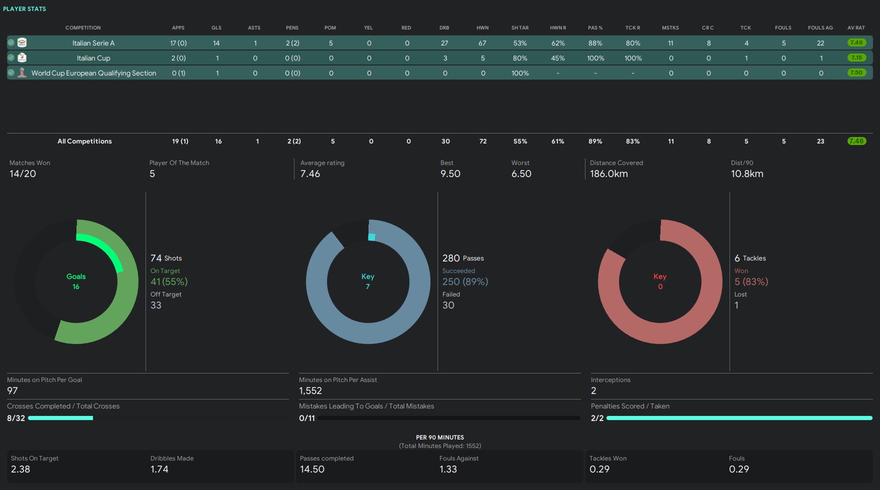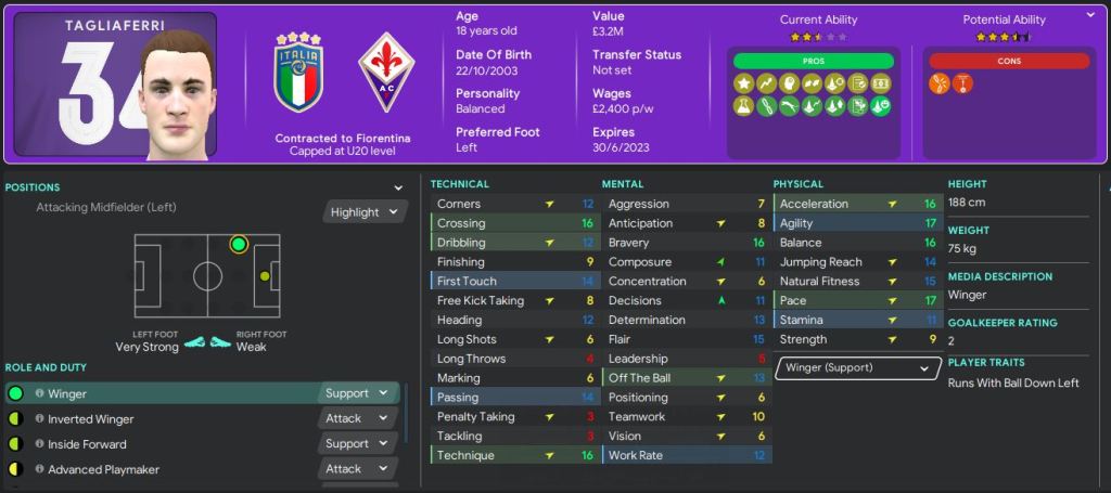 Our wonderkid Tagliaferri has amazed me! He has scored important goals for us this season, as well as providing crucial assists. He’s got great composure up front, great decisions and pacey. He is only 17 years old, but his performance is unbelievably good. I’m very excited to see how much he can improve and the future. Below are the key stats.