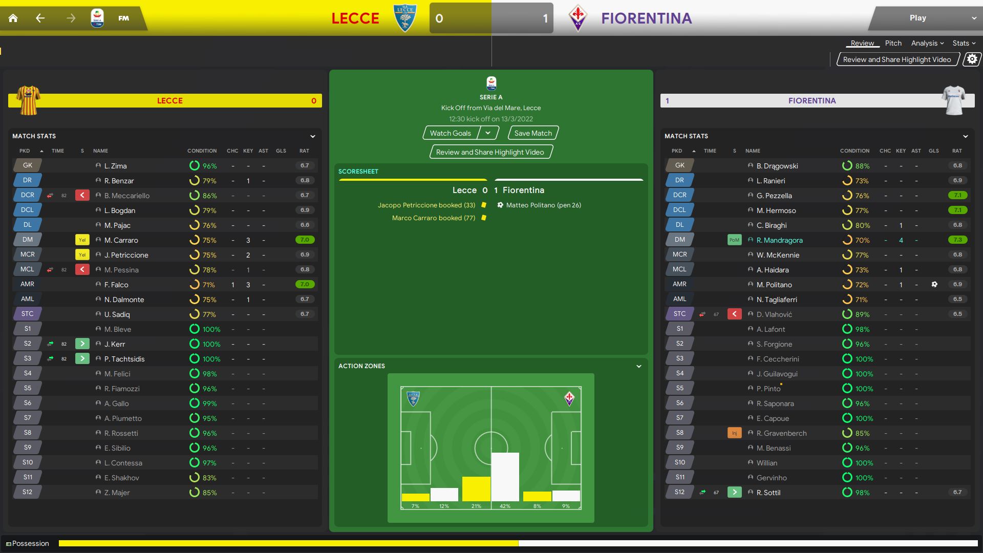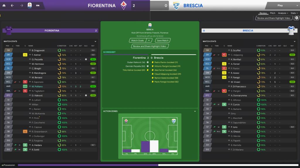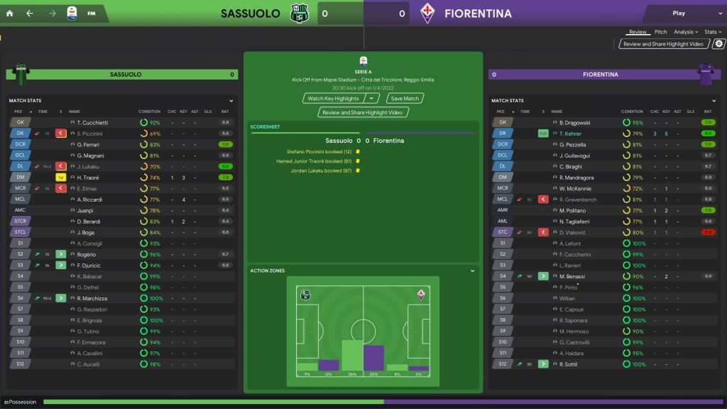 The next game was an away game against Sassuolo. We did poorly out there. It was a 0-0 draw. Dusan Vlahovic received a 5.8 rating in the game, the lowest rating we ever had in this season so far. He missed a couple of big chances in front of the goal. Until the 80th minute, I just can’t stand anymore, and I had to sub him off. Thilo Kehrer was very good in this game. He created so many chances to our front three, but none of them were in the back of the net.