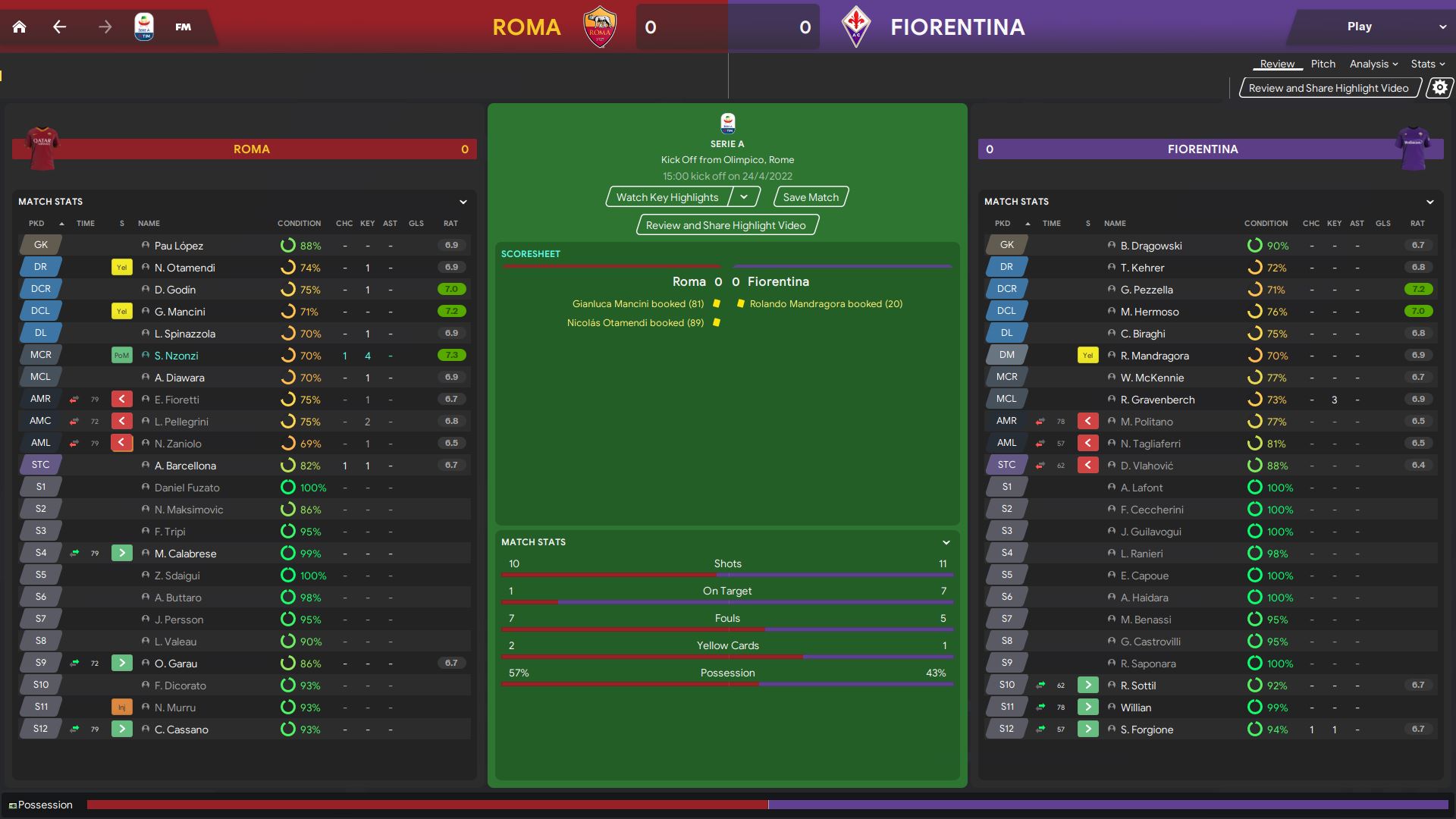 As expected, it was a tough game against Roma. We failed to collect 3 points from the Olimpico. The game finished 0-0. Both teams failed to score a single goal as well. Our front three weren’t clinical enough, they missed a lot of big chances, and eventually I subbed off all three of them. We had 11 shots and 7 on target, meanwhile all the shots were very bad. Roma’s defence had a solid game, unfortunate for us. Hopefully, next game would be better.