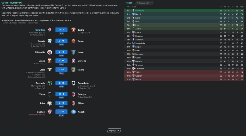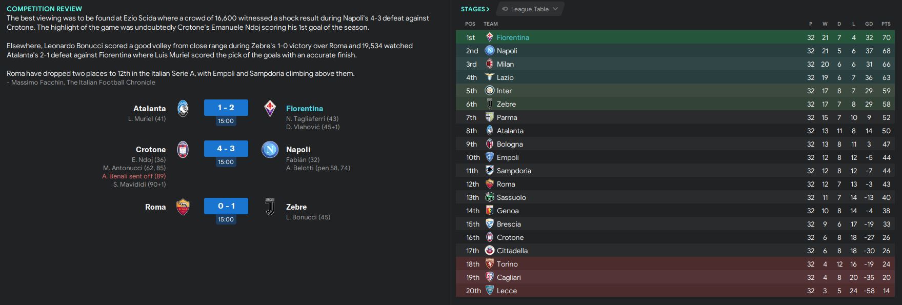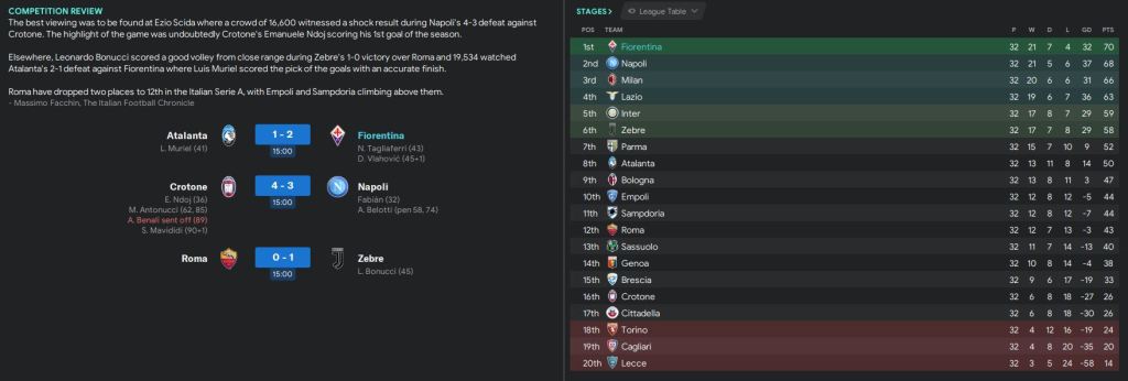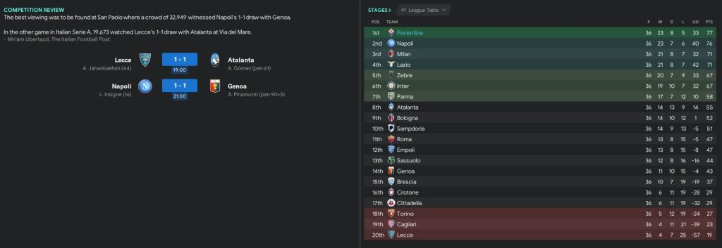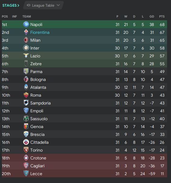The next game against Sampdoria was a 2-0 victory for us. Marco Benassi scored an absolute screamer outside the box, and Nicola Tagliaferri got himself in the scoresheet again. Napoli won their game as well, but Milan only took 1 point from his opponent this time. With only 5 games left, 4 teams are currently battling for the title.