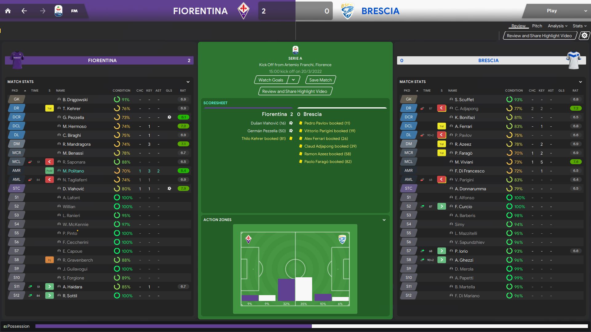 The second game was against Brescia. It was a home game. We played well in this game with Dusan Vlahovic scored the opener at the 16th minute. Our captain, German Pezzella then scored a header at the 50th minute. Brescia got no chance in this game. Matteo Politano once again stepped up and delivered a great performance by providing 2 assists.