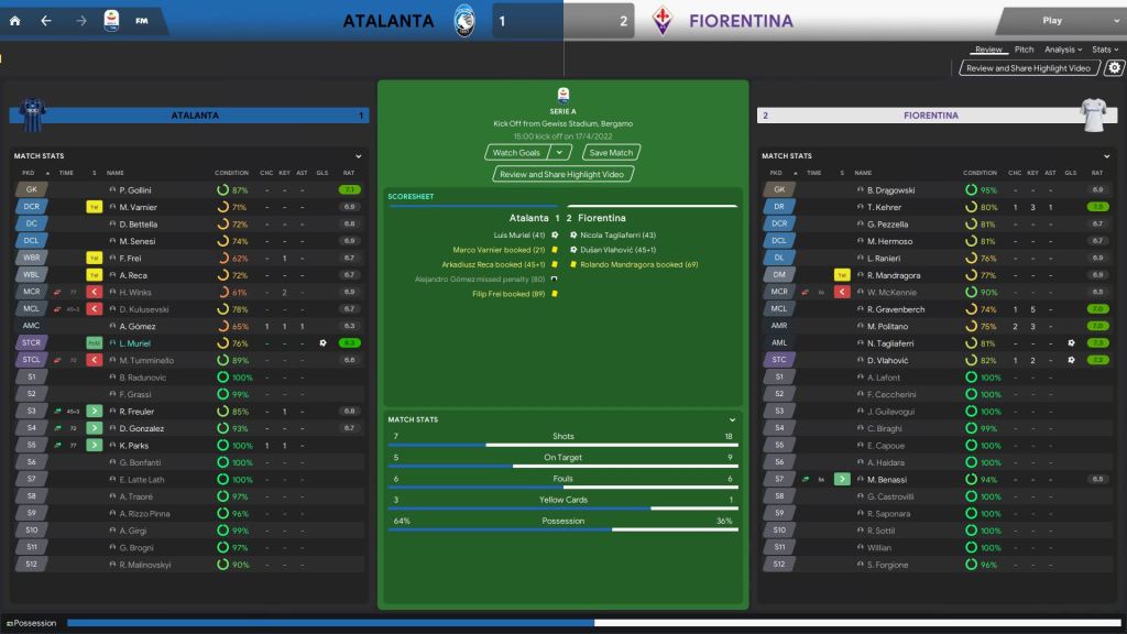 We have done it! What a massive win it is! After playing 90 minutes in Gewiss Stadium, we successfully beat Atalanta 2-1. The game was very intense. All 3 goals are scored in the first half between 41st minute and 46th minute. Atalanta scored the first goal with Alejandro Gomez made a beautiful long pass finding Luis Muriel. The Colombian striker took his chance and scored the one-on-one against our goalkeeper. 2 minutes later, Nicola Tagliaferri won the ball at the left flank. He then made an insane dribble into the box and hit the ball into the back of the net, 1-1! Right before the half time whistle, Thilo Kehrer hit an early cross from the right, Dusan Vlahovic volleyed the ball into the bottom corner, 2-1 for Fiorentina. At the 80th minute, Atalanta had a chance to score a penalty after Mario Hermoso committed a foul in the box. However, Alejandro Gomez failed to keep the nerve and sent the ball over the bar.
