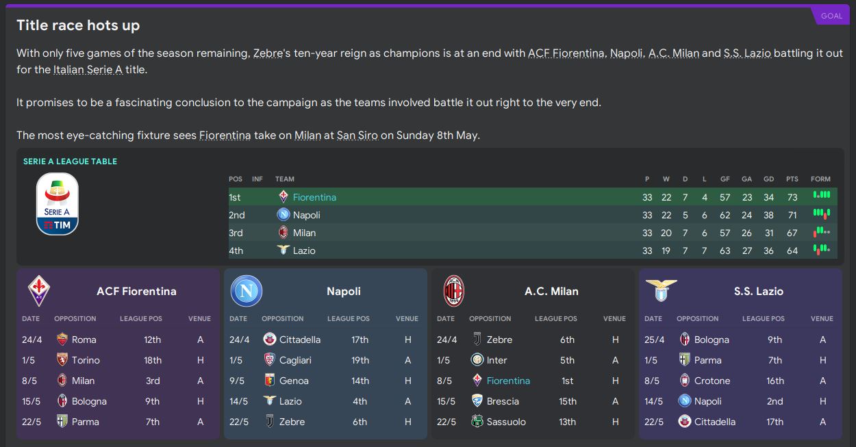 How’s it going on guys and welcome back to the ABTFM blog. Today, we are back with another chapter of the Fiorentina Journey. In the last chapter, we played against some big teams like Lazio, Juventus and Inter Milan. In the league itself, we were sitting at the 2nd position with 1 point behind Napoli. On the bright side, we made it to the Final of the Italian Cup after beating Inter in the 2 legs Semi Final. Today, we are back in the league. We are now pushing towards the end of the season. Without further ado, let’s jump straight in to the Fiorentina Journey.